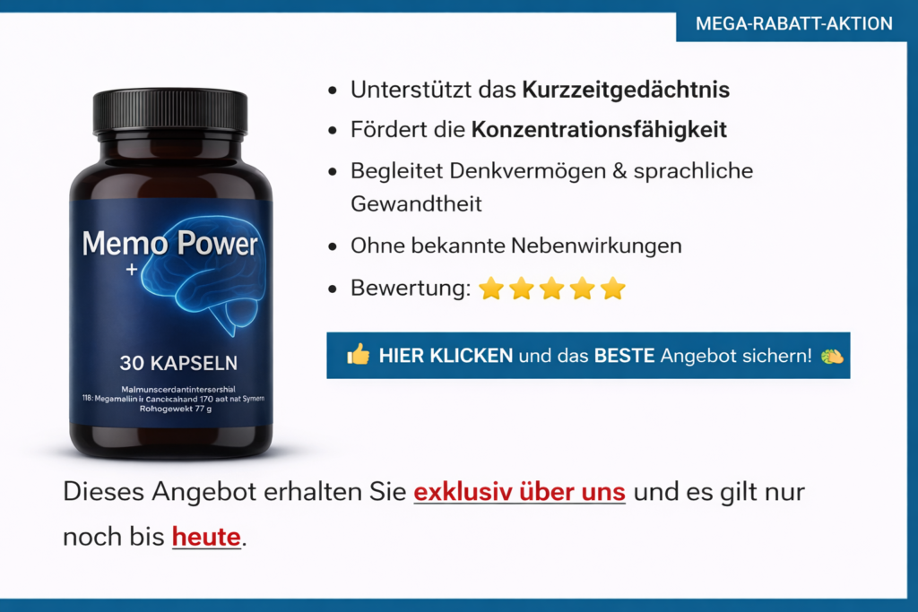 Aufgrund der Vielzahl täglicher Anfragen hinsichtlich Rabattaktionen und Gutscheincodes haben wir exklusiv für unsere Leserschaft das momentan vorteilhafteste Angebot für die Memo Power Kapseln zusammengestellt und untenstehend aufgeführt. Bitte berücksichtigen Sie stets, dass solche Aktionen oftmals zeitlich begrenzt sind und ausschließlich über den nachstehenden Link zugänglich sind. Dieses Spezialangebot gilt nur noch bis heute.